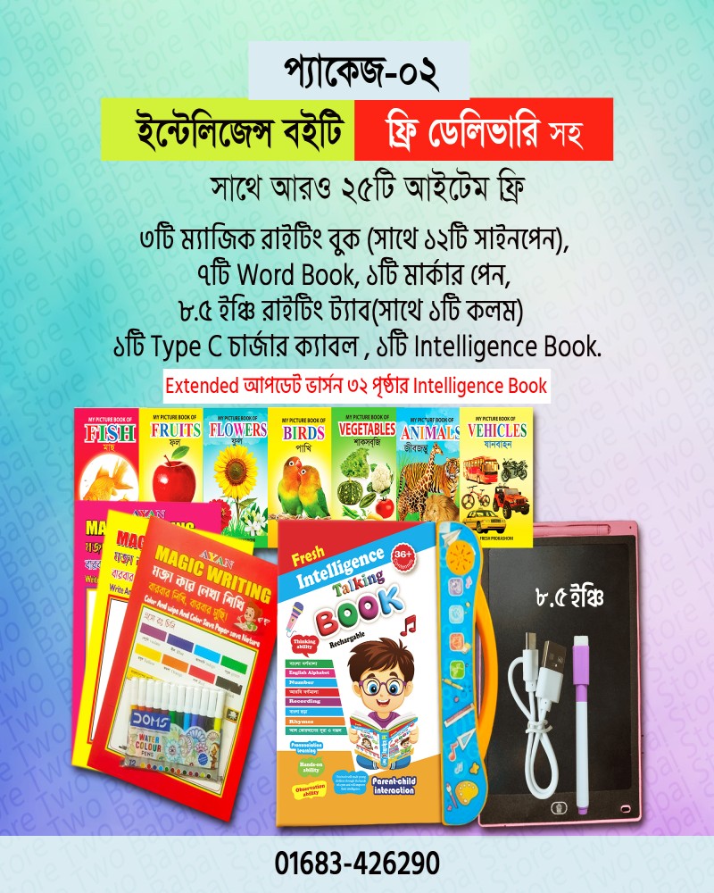 অর্ডার করলেই ফ্রি পাচ্ছেন: * ১টি ইন্টেলিজেন্স বুক। * ১টি Type C চার্জার ক্যাবল। * ৩টি ম্যাজিক রাইটিং বুক * ১২টি সাইনপেন * ১টি মার্কার পেন * ৭টি ওয়ার্ড বুক ও * ১টি ৮.৫” ইঞ্চি রাইটিং ট্যাব ও কলম।